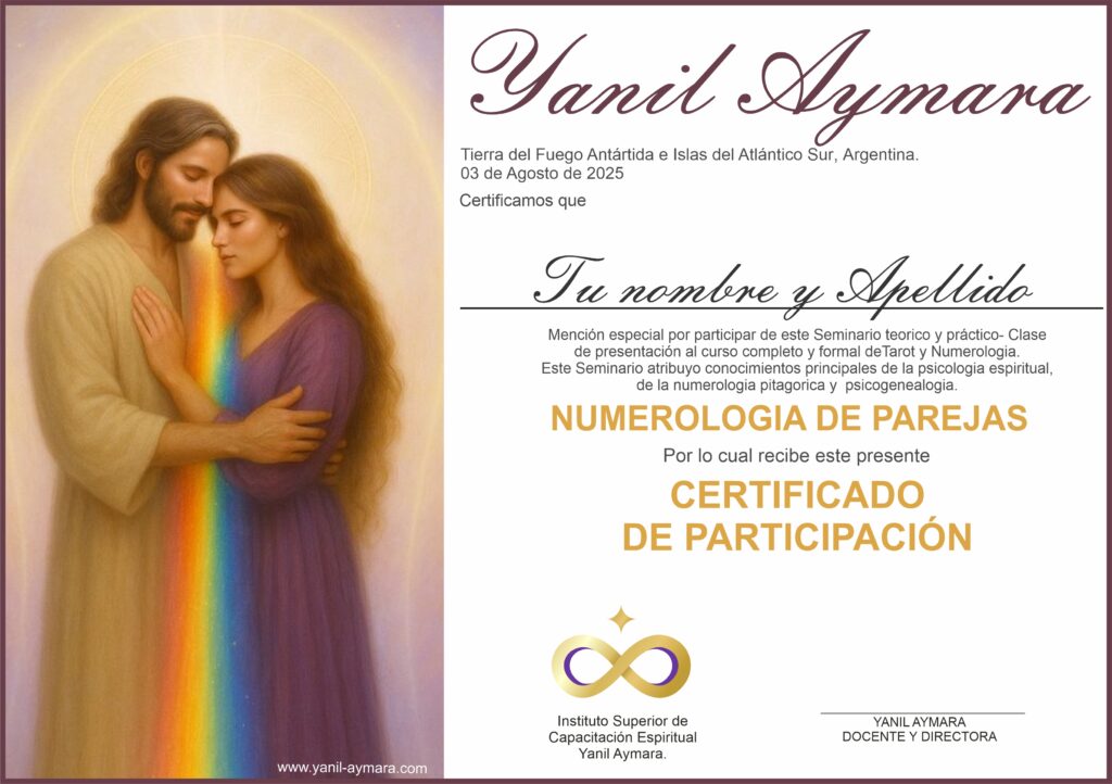 Módulo 1: El vínculo como espejo del alma Breve introducción a la numerología del alma Las relaciones como resonancia vibracional Qué dice tu número del alma sobre cómo amás y te vinculás Influencia del número de día de nacimiento y del nombre Módulo 2: Compatibilidad energética y caminos en espejo Cómo calcular la Compatibilidad numerológica entre dos personas: Número del alma propio y número del otro Caminos de vida compatibles, tensos y complementarios Números espejo, duplicados, faltantes Parejas kármicas: señales y vibraciones que las delatan Números maestros en pareja: ¿parejas guía? Módulo 3: Heridas vinculares según los números El lado oscuro de cada número en relación: 1: control / 2: dependencia / 3: evasión / 4: rigidez / 5: inestabilidad / 6: fusión / 7: desapego / 8: poder / 9: autosacrificio Cómo se manifiestan las heridas de la infancia (abandono, rechazo, traición, etc.) según el número de la pareja Números heredados del linaje que condicionan vínculos (transgeneracional numerológico) ejercicio sistémico: observar qué números repetís con mamá/papá y cómo se proyectan en tus vínculos. Módulo 4: Mapeo numerológico de la relación Cómo calcular el Número del Vínculo (sumando fechas de ambos) Año Personal conjunto y ciclos energéticos compartidos Momentos clave de la relación según los años numerológicos Módulo 5: Sanación, integración y liberación ¿Qué me vino a mostrar esta persona según la numerología? ¿Cómo activar una nueva vibración vincular? Decretos de armonización según cada número Ritual de cierre: corte kármico o fortalecimiento del vínculo